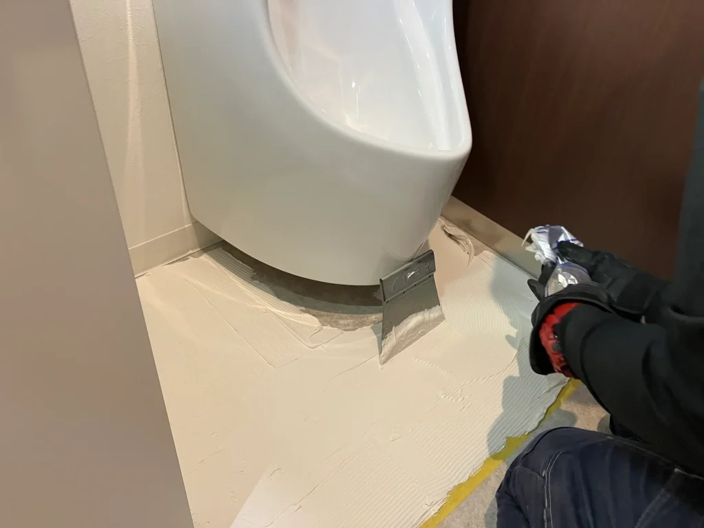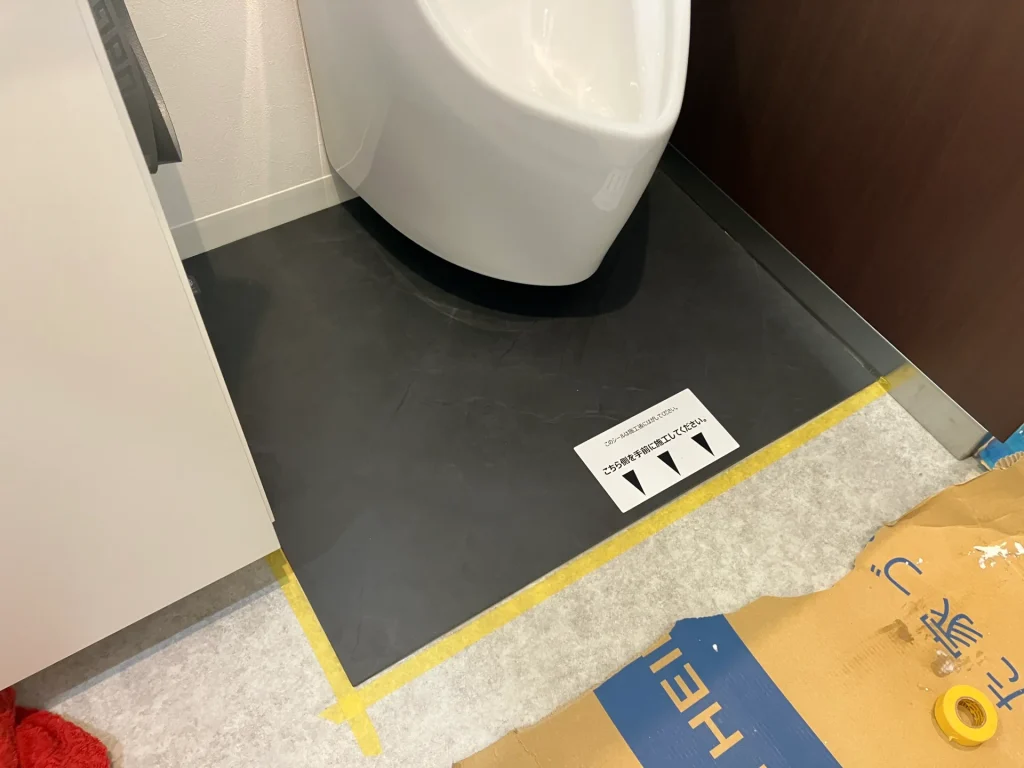 今回設置したのは、小便器の足元の床に敷く専用のパネルです。 建築や内装の業界用語では「汚垂石(おだれいし)」とも呼ばれます。