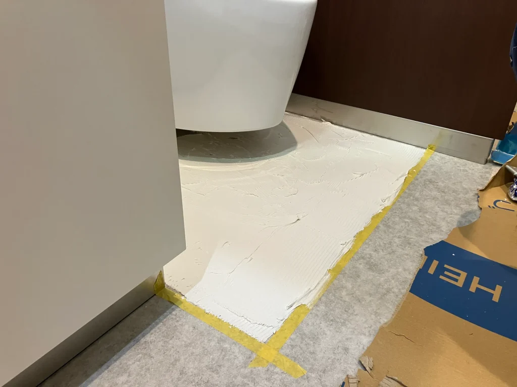 まずは、パネルを設置する範囲を正確に測定し、床に専用の接着剤を広げていきます。ヘラを使って均一な厚みに伸ばしていくことで、パネルが浮いたりズレたりしないよう、丁寧に下地を作ります。