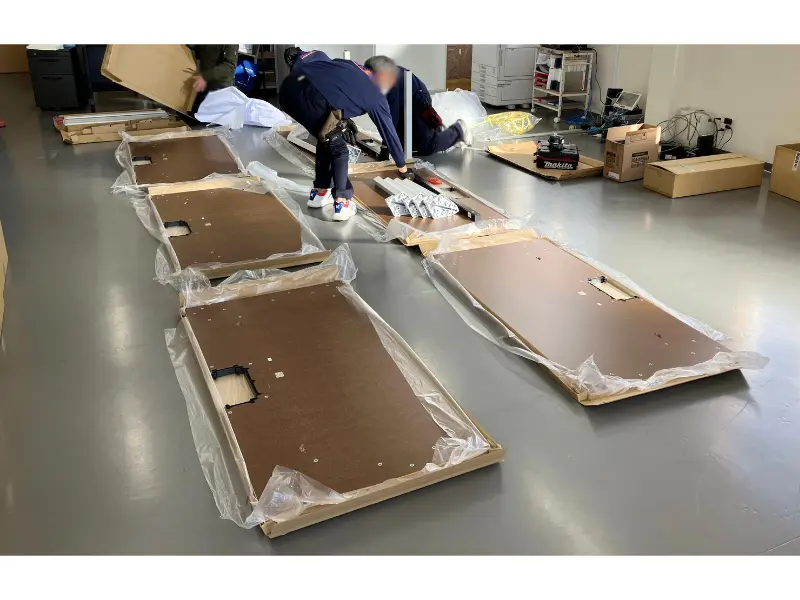 施工の際は、8枚の天板を現場で丁寧に連結し、ひとつの大きなロングデスクを組み上げます。