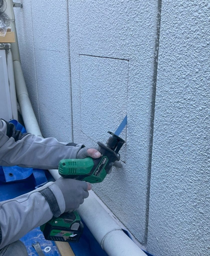 次に、給気ガラリと有圧扇を取り付けるため、工場の壁を専用の工具で切り抜く開口工事を行います。