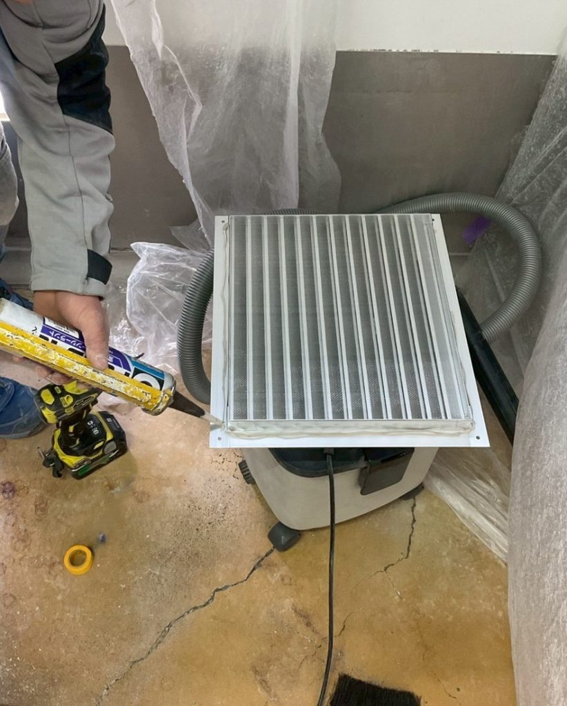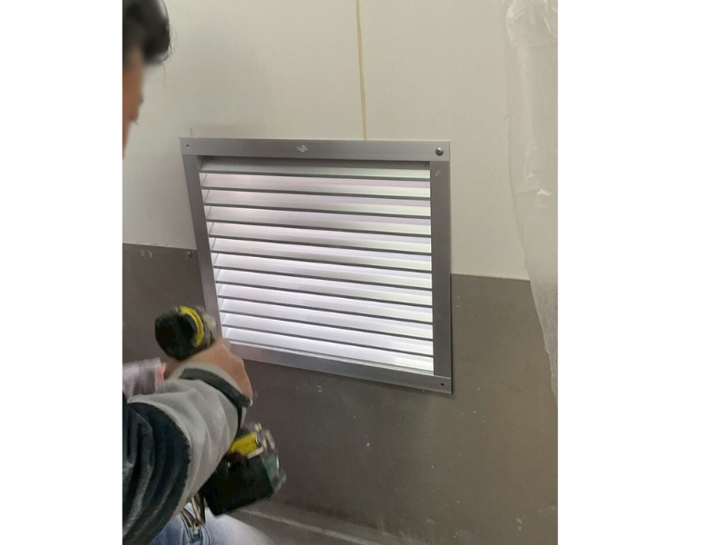 切り抜いた開口部に、まずは新鮮な空気を取り込むための「給気ガラリ」を取り付けます。 外壁とガラリの間から雨水が浸入しないよう、隙間をコーキング剤(シーリング材)でしっかりと埋め、防水処理を施します。