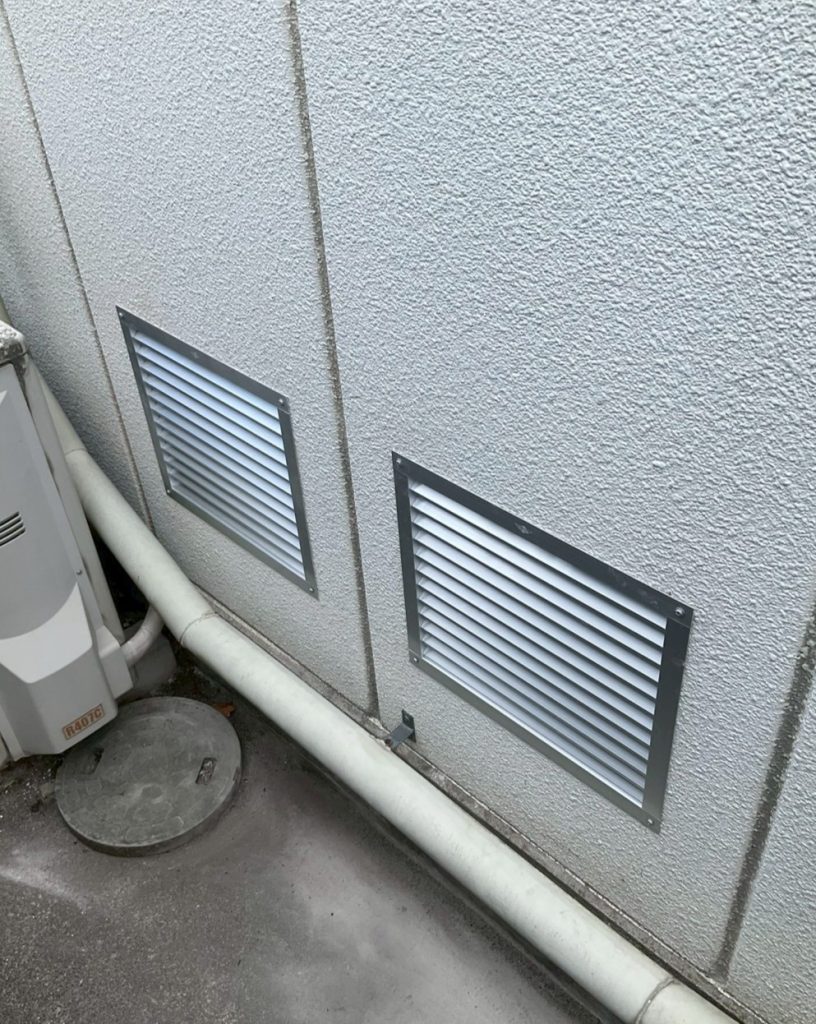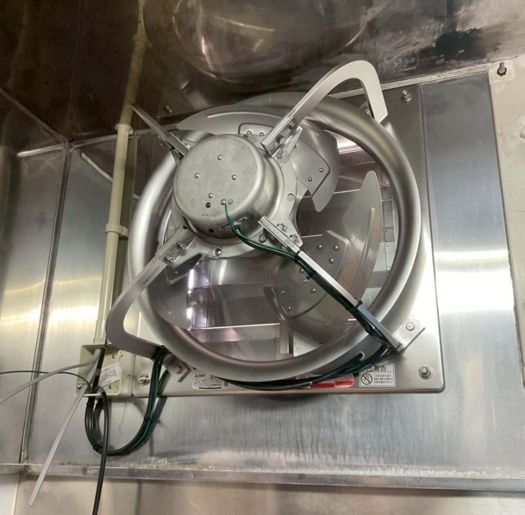 「今の換気では追いつかない」というお悩みを解決するため、外気を取り入れるための給気ガラリ(空気の取り入れ口)と、強力な排気能力を持つ有圧扇(ゆうあつせん)の同時設置をいたしました。